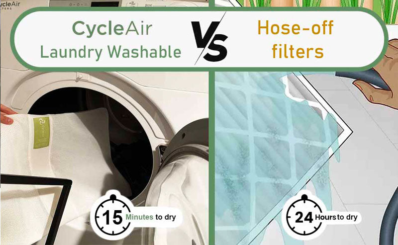 This is what's pretty cool about Cycle Air Filters – they are laundry washable and dryer safe. No lugging it outside in the cold to hose off—it’s quick and easy (especially if your washer is in the same room as your furnace... no excuses!), and since it's dryer safe it dries in about 15 minutes instead of 1–2 days.